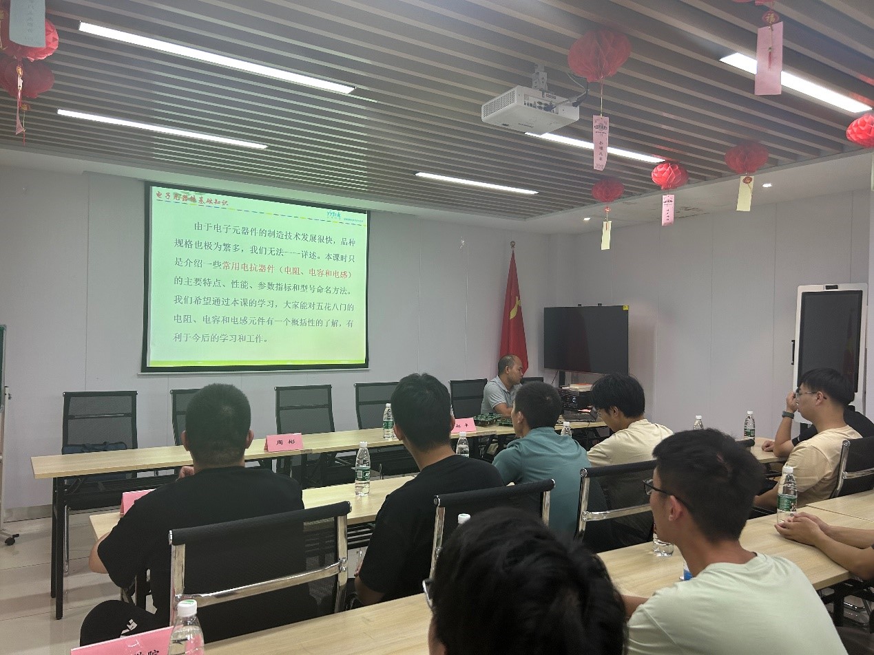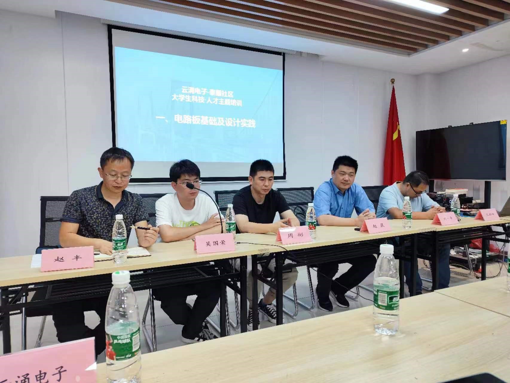 在培训的第一讲中,基于老化采集控制系统,主要围绕"电路板的基础设计和调试"展开,包含了电子元器件基础知识、PCB技术与焊接工艺以及原理图设计案例等内容。第二讲是嵌入式软件开发及调试的介绍,第三和第四分别是自动化测试管理系统和测试治具等相关内容。参与学习的有来自泰州学院、泰州职业技术学院以及泰顺社区的众多大学生。