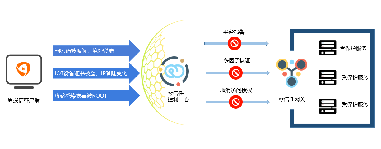 澳门新葡京平台官网零信任持续侦测终端运行环境,包括操作系统环境及网络环境等。系统针对终端运行环境变化,依据安全基线策略及登录认证策略等,实时响应并触发不同级别的措施如MFA、告警或立即阻断等。