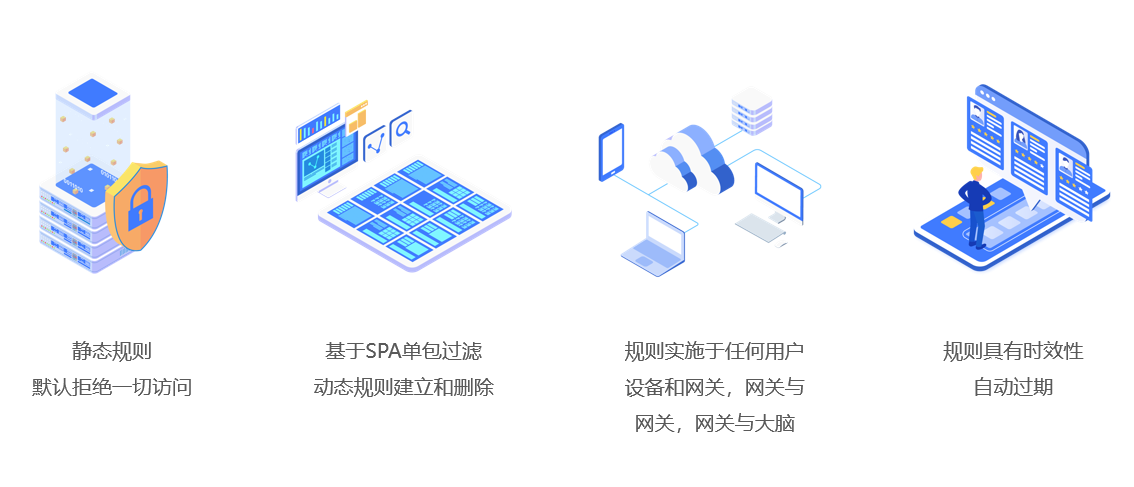 产品基于先进的零信任理念即永不信任、始终验证原则,采用SDP软件定义边界网络安全架构,通过服务隐藏及单包敲门技术、细颗粒度最小授权管理及风险动态识别能力,通过微隔离、防数据泄漏等手段,提供安全可靠的网络接入与访问控制,打造平台级的身份与数据安全管控系统,重点解决企业远程网络接入安全,以及企业工业设备的南北向数据接入安全以及东西向数据访问安全。